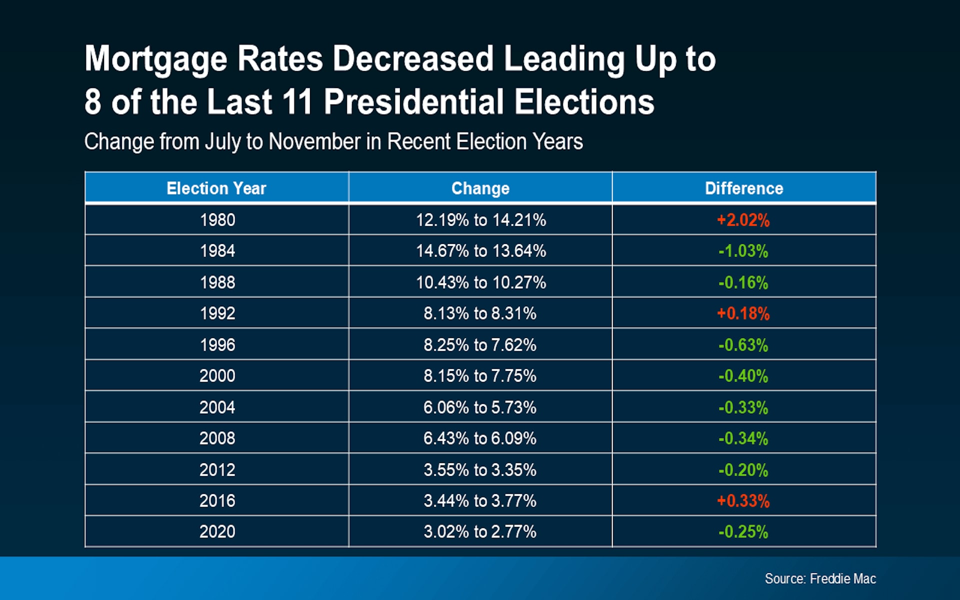 Mortgage rates matter, especially if you're financing a home. In 8 of the last 11 elections, rates dropped from July to November, according to Freddie Mac data.
